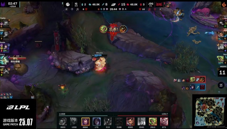 【17:00】野区遭遇,多个人的iG果断开团秒掉了Scout加里奥!Rookie阿狸魅惑再留MISSING洛!iG打出0换2!拆掉JDG的中一塔!反超经济!