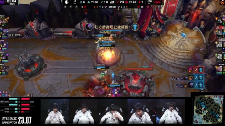 【25:19】JDG抱团借助大招强行越塔击杀Meiko牛头之后回头开打大龙,iG想看结果被绕后的Scout加里奥闪现嘲讽两个,GALA卡莎被秒了!JDG再次回头打大龙卡2000血打团,iG冲锋TheShy鳄鱼一打三拖够了时间!帮助Rookie阿狸抢到了大龙!但是Peyz泽丽在队友的重重保护之下拿到双杀!这波JDG的2换3!