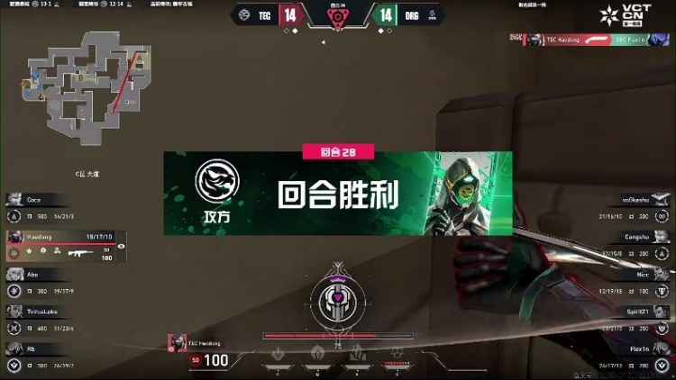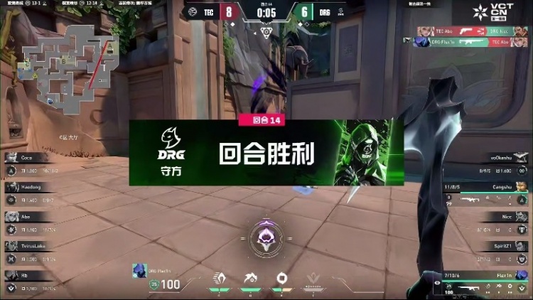 第十四局:TEC开局选择假打A后选择转C,但是DRG两人回防C点成功将TEC堵在C点外,DRG成功收下TEC五人拿下胜利!