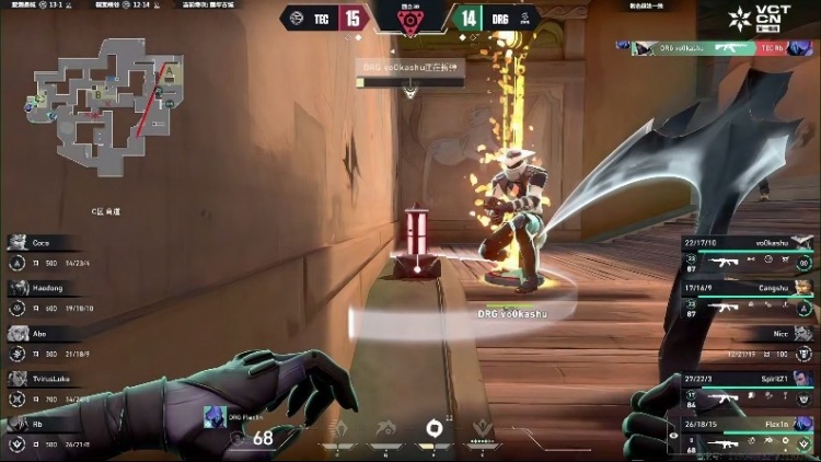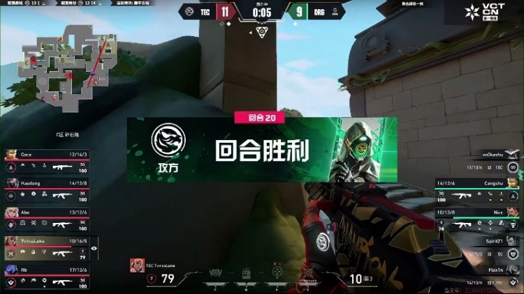 第二十七局:TEC开局直接进攻C点,DRG只能选择放点打回防,DRG回防双方围绕C点5打5,TEC成功艰难拿下残局获得胜利!