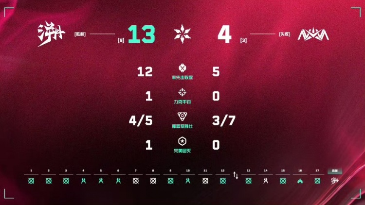 TE上半场凭借LuoK1ng的发挥拿下手枪局后连拿四分,后续NOVA的防守完全陷入被动,TE多人持续发挥打出得分潮,最终TE上半场带着9-3的比分成功来到下半场,下半场TE再次拿下手枪局,虽然NOVA凭借强起拿下一分但是后续TE凭借BIank一波兜底三杀成功也完成翻盘,后续NOVA面对TE完全没有抵抗之力,TE 13-4顺利拿下NOVA晋级下一轮!