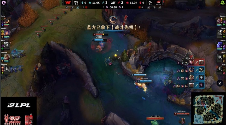 【6:21】巢虫团,Tarzan蝎子推人上墙,Shanks瑞兹吃掉Vampire牛头一血,侧面Karis安蓓萨击杀Kael蜘蛛,Flandre吃掉Karis安蓓萨人头,AL打出2换3。
