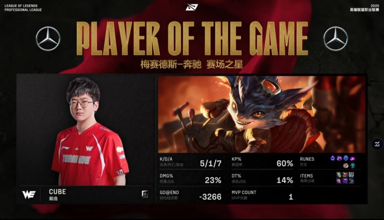 第二局前期巢虫团混战AL打出2换3,下路团战王杰烬击杀WE中辅拿到双杀,但大人头被Cube兰博吃下。中期野区双方打野互换,Kael终结被Taeyoon吃到。