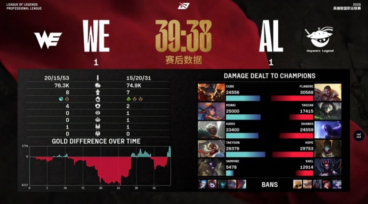 后期WE入侵AL野区打出0换3后吃掉大龙,AL两人看大龙反而被杀,WE拉平境界劣势。后期AL三人偷掉大龙,但WE下路推进,Taeyoon飞机狂轰三杀,WE打出1换3一波推平AL基地扳回一城。