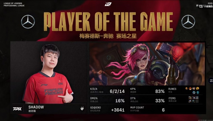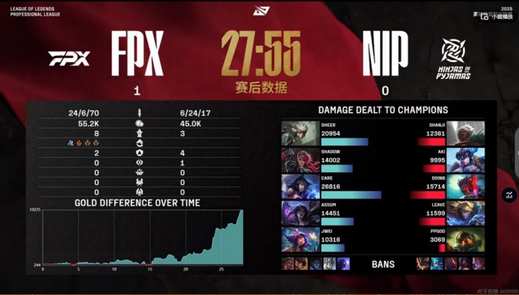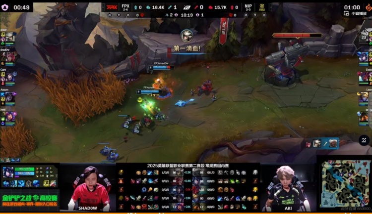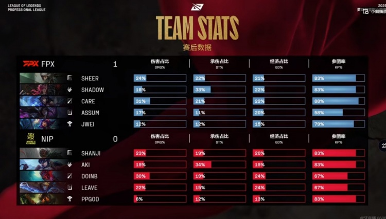 首局比赛AKi选出猪妹但是没什么节奏,反而是到6以后的shad0w蔚连续大招帮助FPX拿下节奏的主动权!有线权的FPX在资源上也给到了压力!中期虽然shad0w蔚连续两次锁头被带回防御塔下白给,但是sheer青钢影大招操作配合辅助Jwei妮蔻每波保底大三个让FPX的团战真的非常好打!龙魂团NIP来看结果被Jwei妮蔻闪现火箭腰带打了五个!这波FPX团灭NIP推掉下路高地之后奠定胜局!最后的厄塔汗团战绕后的NIP下路组直接被逮捕,FPX再次团灭NIP,大龙都不需要打了,结束了首局比赛!