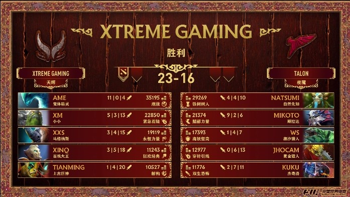 【38分钟】XG下路上高,Ws潮汐过来跳大后,被xxs马格纳斯反手大三人,Tianming上古巨神接大留住了所有人,Ame水人撒旦一开就是收割,Talon被打一波五人团灭,XG直接破高拆基地,Talon打出GG。XG翻盘成功拿下局一。