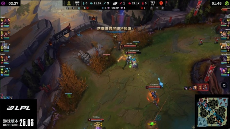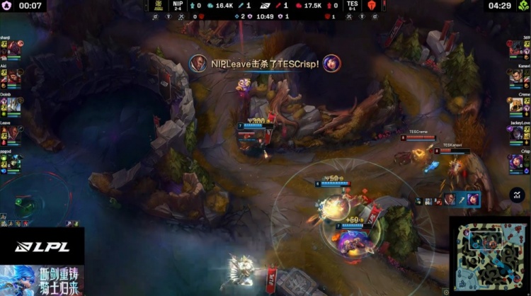 中期小龙团哥哥被Leave轻松击杀,NIP打出0换3冲上TES高地,刘神妮蔻门牙塔前控住Leave,Leave抗塔过多大人头送给Creme,NIP三人瞬间阵亡,TES吃掉大龙,将经济劣势追回至2k。