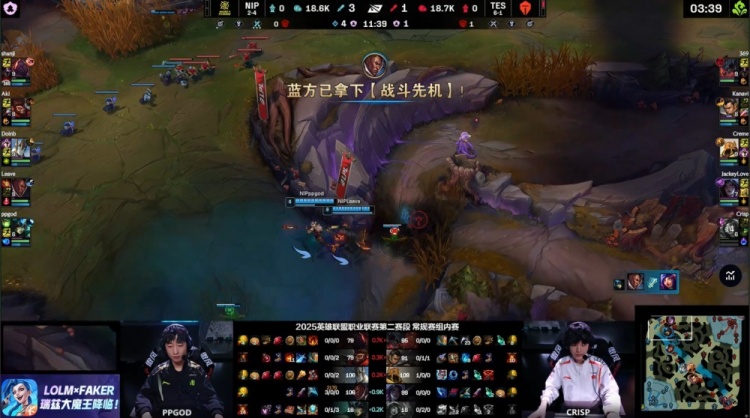 【15:26】河道开团,Aki猴子进场开转,ppgod娜美Q起TES两人,Leave击杀TES中野拿到双杀,NIP打出0换2,经济领先2k。