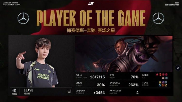 第二局前期小龙团,ppgod娜美Q飞TES两人让Leave拿到双杀,后续Kanavi赵信持续阵亡,Leave伤害爆炸带走哥哥,NIP打出0换4,经济领先5k。