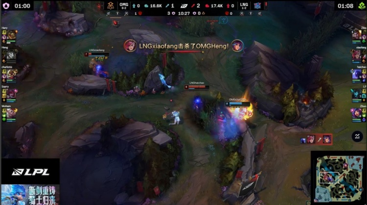 【16:44】LNG入侵OMG野区逮捕Heng,Zhuo妮蔻跟大吃掉人头,LNG经济领先2k。