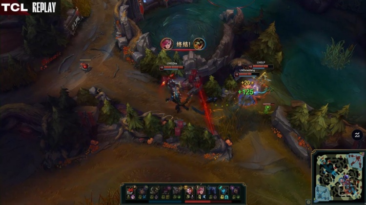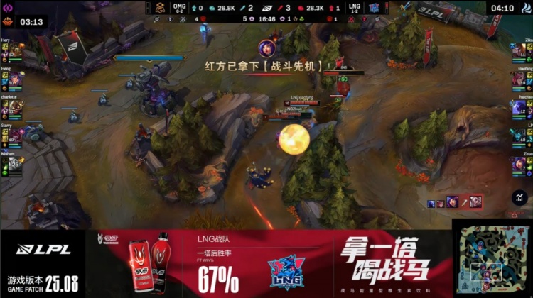 【25:18】大龙团,LP吃掉大龙,正面Zhuo妮蔻开团,Moham洛反手开两人,xiaofang蔚被击杀,charlotte飞机也被击杀,LP卡莉丝塔野区逮捕Moham不断扎矛,Moham洛W过墙但被LP开E爆死,LNG经济领先7k。