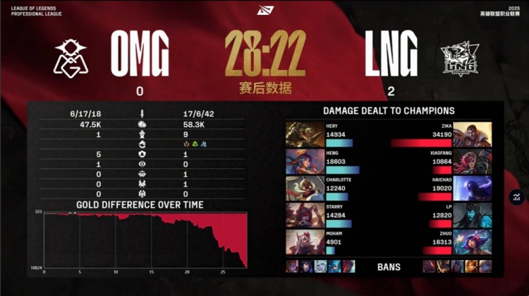 中期Hery下路三角草落单阵亡,LNG听牌风龙魂,厄塔汗团战,Zika杰斯大锤落地双杀,LNG吃掉渴血厄塔汗打出0换5团灭OMG,经济领先5k。大龙团,LP先吃大龙,Moham洛被LP拔矛击杀,LNG经济领先7k。最终Zika与haichao收割战场,LNG瞬间团灭OMG,一波推平OMG基地拿到比赛胜利。
