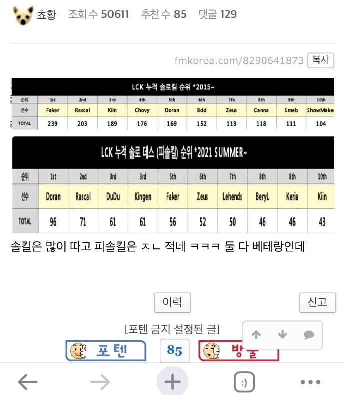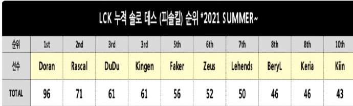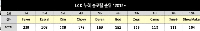 直播吧4月24日讯 近日,有韩国网友整理了LCK自2015年以来的单杀榜和2021年夏季赛开始的被单杀榜,其中在单杀榜中,Faker以239次单杀排名第一;而被单杀榜中,Doran以96次被单杀排名第一!