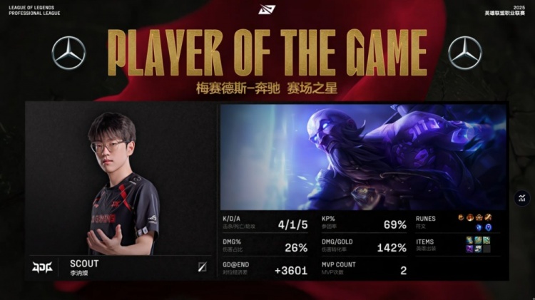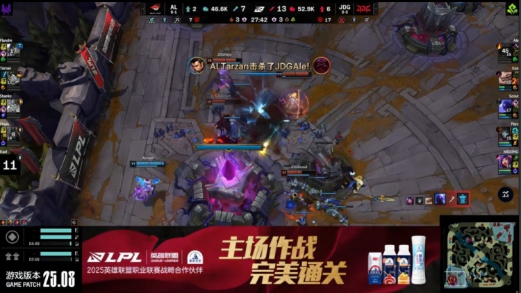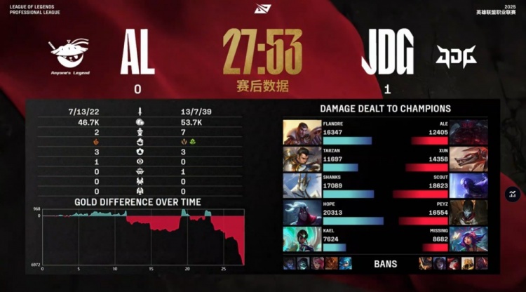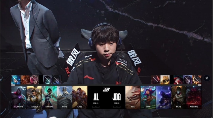 后期AL五人上路强行越塔击杀Ale后回头开厄塔汗,Scout瑞兹绕后狂砍三杀,JDG吃掉渴血厄塔汗,经济反超2k。随后JDG下路推进,Ale叫羊配合队友瞬间打出0换4,JDG强行冲上AL高地推平基地杀死比赛先下一城。