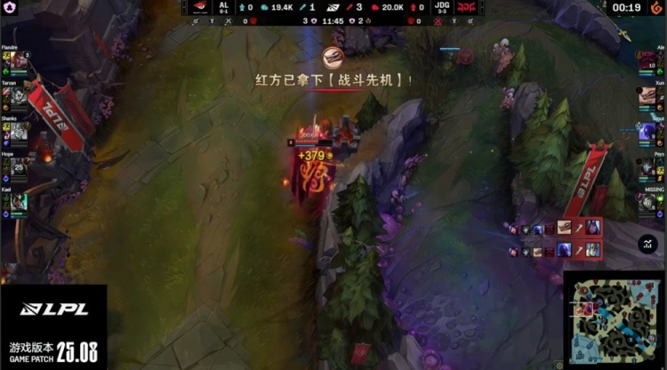 【22:22】AL五人去上越塔强杀Ale得手,JDG众人姗姗来迟,AL回头去开厄塔汗,Scout瑞兹绕后秒掉Tarzan再杀shanks与Kael拿到三杀,AL上射两人急忙撤退,JDG打出0换3吃掉渴血厄塔汗,推掉AL中路一塔,经济反超2k。