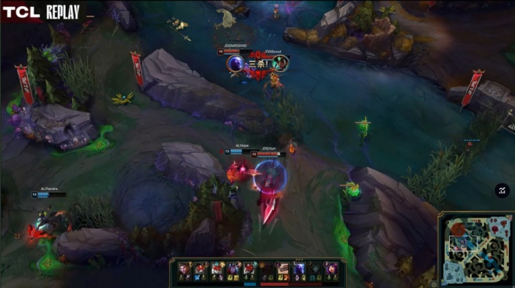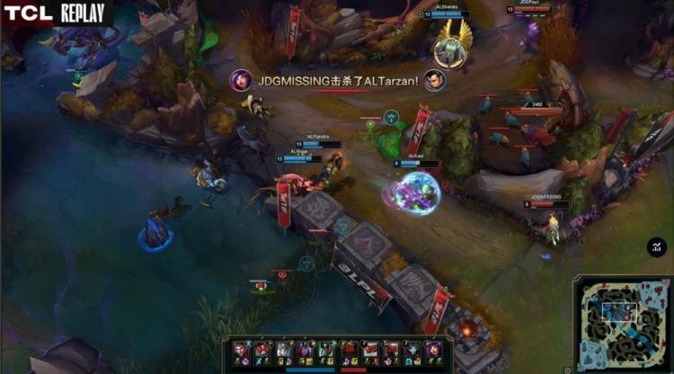 【14:52】河道团战,Ale叫羊撞飞Tarzan赵信,Peyz拿到人头后再杀Shanks拿到双杀,随后Peyz野区架狙打残王杰,JDG打出0换2,经济领先2k。