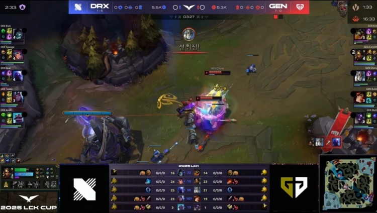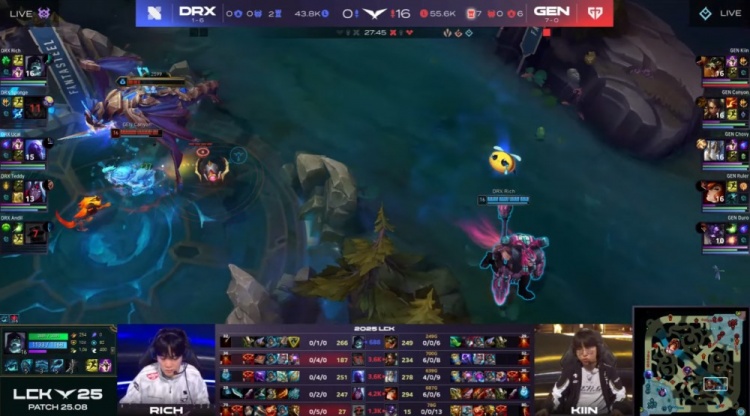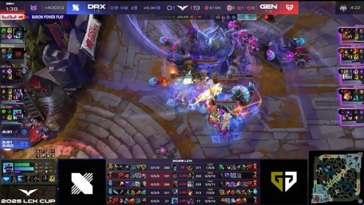 中期先锋团Duro牛头绕后开DRX三人,Ucal瑞兹想开车带队友飞走被Kiin鳄鱼卸掉车轮,GEN打出0换5团灭DRX。后期DRX毫无一战之力,21分钟GEN经济领先1w。