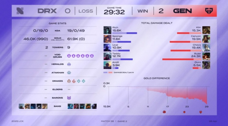最终GEN轻松吃掉电龙魂与大龙,Rich下路推掉GEN二塔也无能为力,GEN中路冲上DRX高地轻松推平DRX基地,击杀比锁定在0-19,GEN拿到比赛胜利。