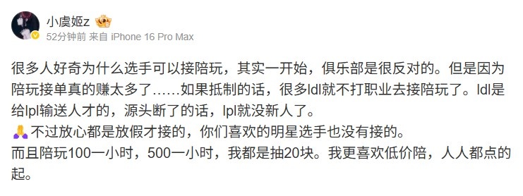 随后她又发文谈到目前LPL、LDL俱乐部与陪玩之间的关系: