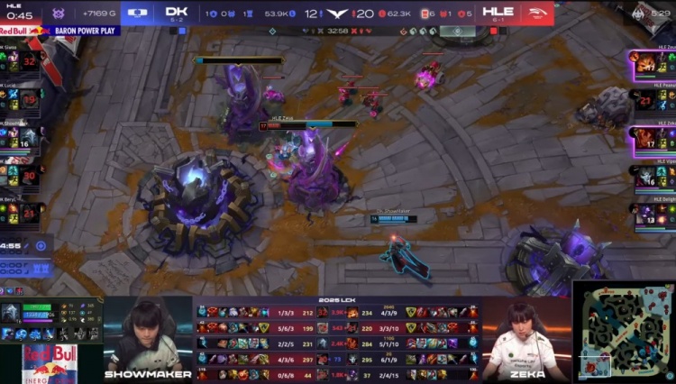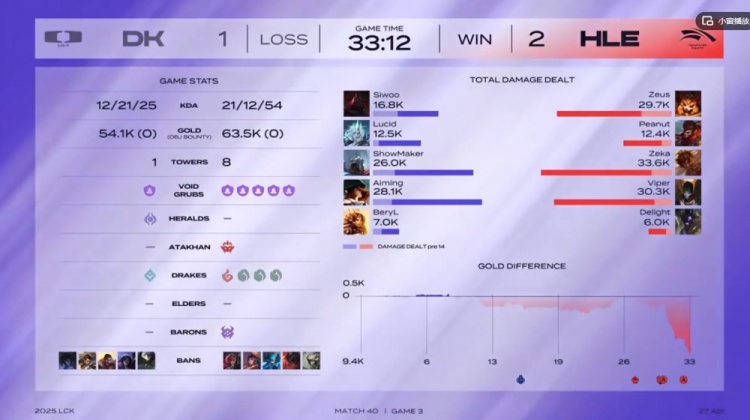 决胜局开局Siwoo塞恩对位单杀Zeus纳尔拿下一血!但是HLE几波团战帮助Zeus纳尔拿到击杀打回了场子!中期HLE控资源但是Zeus纳尔上路急了被DK三人反杀,Lucid佛耶戈还在下路埋伏配合维克托击杀掉了Zeka岩雀!但是Viper烬远程输出磨血配合队友击杀曙光,HLE拿下渴血厄塔汗,再借助复活甲大龙逼团换掉了DK上野!趁着时间差强行拿下大龙!DK想来看但是被Viper烬闪现向前,配合拍三个的Zeus纳尔解决掉了Aiming女枪!HLE成功团灭DK!