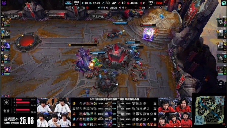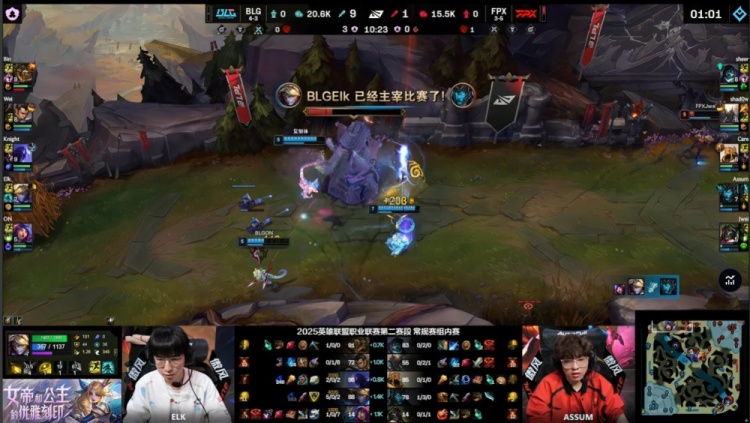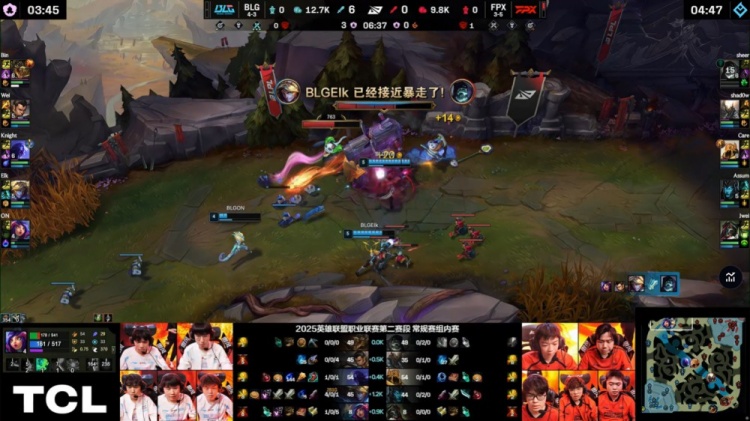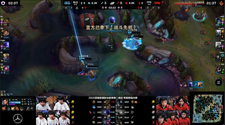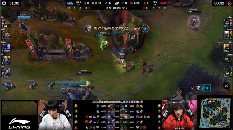 第二局开场BLG四人入侵FPX野区找人,Elk拿到Assum一血,BLG打出0换3,随后回到线上Elk再杀Assum,BLG双人换线去上Elk带走sheer,Assum换线来上被Elk连续击杀两次,BLG10分钟经济领先6k。