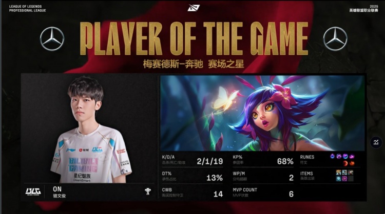 后期比赛早已失去悬念,BLG吃掉灭尽厄塔汗,阿Bin两度单杀sheer掘墓,BLG轻松冲上FPX高地推平基地扳回一城。