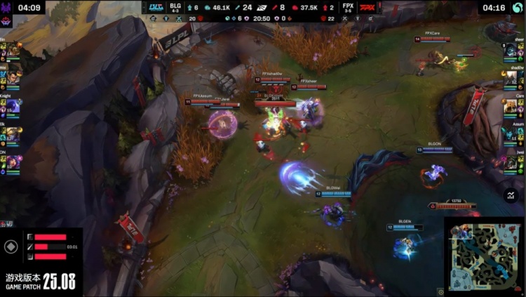 【25:05】BLG下路推进,Assum卡莉丝塔与Wei赵信互换,BLG三人冲上FPX高地,FPX上野瞬间阵亡,BLG打出1换4一波推平FPX基地扳回一城。