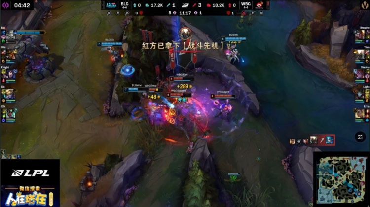 【11:11】河道团战,阿Bin三角草被Breathe杰斯大锤骑脸,WBG众人将其融化,Wei皇子EQ进人群没等火锅盖下就闪现拉开,Light烬架狙拿到Wei人头,WBG打出0换2。