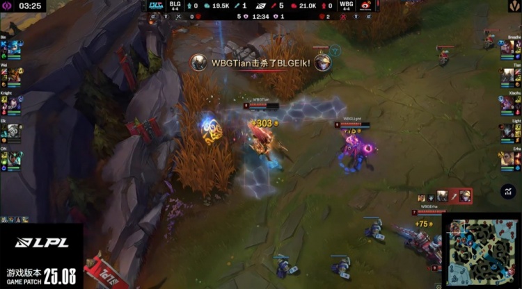 【15:23】ON河道眼上被抓,Light先杀ON,wei皇子进场不盖火锅又被击杀,Elk河道被黏住没闪被小天击杀在河道口,WBG打出0换3,经济领先3k。