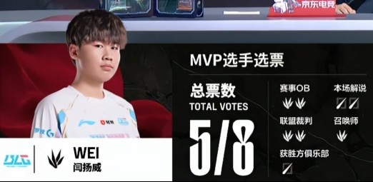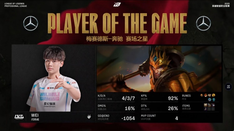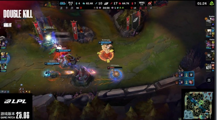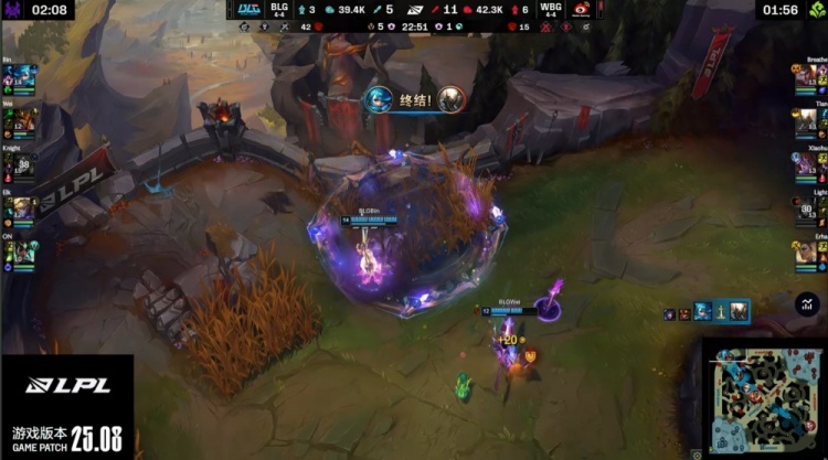 中期xiaohu阿萝拉河道被抓,BLG吃掉灭尽厄塔汗,双方河道混战,WBG打出2换3经济领先4k。随后阿Bin带线多次被抓,WBG持续将经济优势稳定在4k左右。中路Erha芮尔走位扭掉Wei皇子EQ。