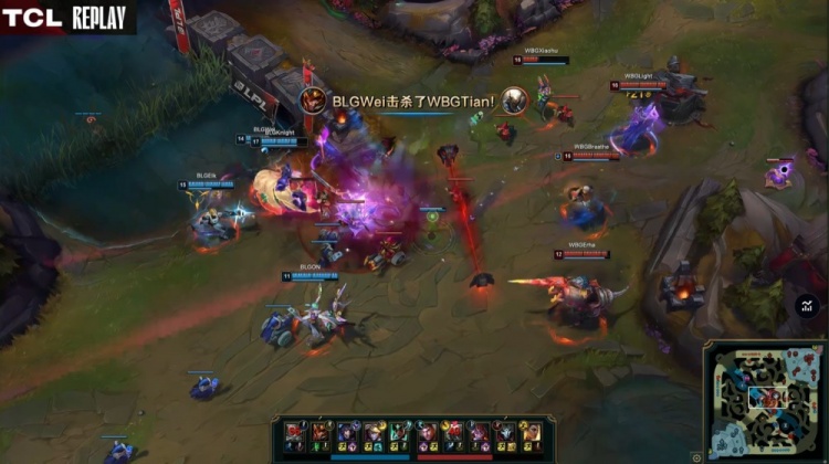【33:28】Erha中路走位扭开Wei皇子EQ二连,随后下路Erha再控阿Bin打出后者金身,侧面Wei火锅盖住Light将其秒掉,BLG打出0换4,中路瞬间一波推平WBG基地惊天逆转扳回一城。