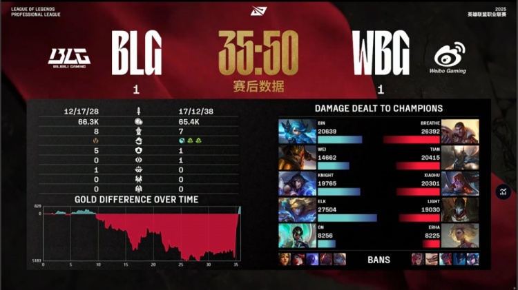后期下路终极团战,阿Bin格温被打出金身,Wei皇子绕后找到机会火锅盖住Light,knight妖狐到位融化WBG后排,BLG瞬间打出0换4上演惊天翻盘,一波推平WBG基地,杀死比赛扳回一城。