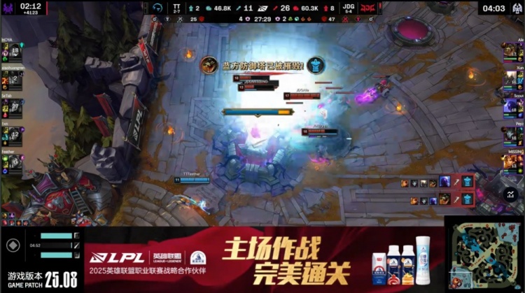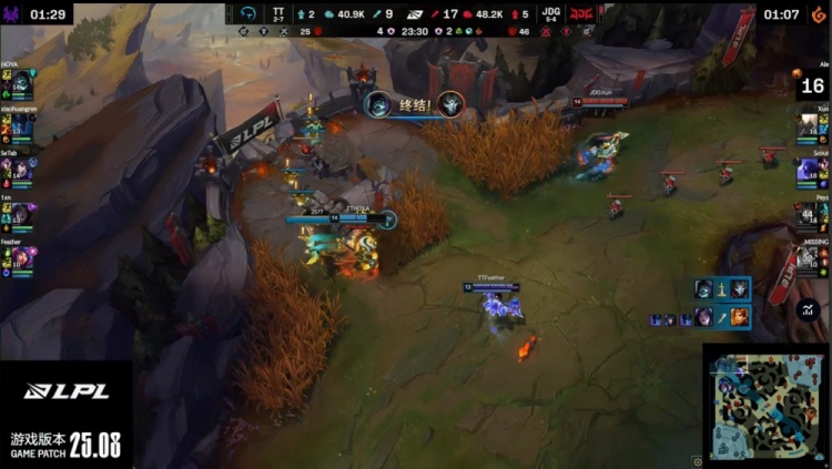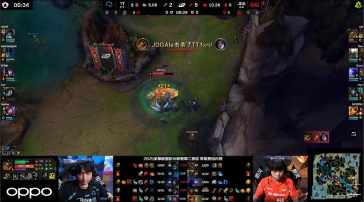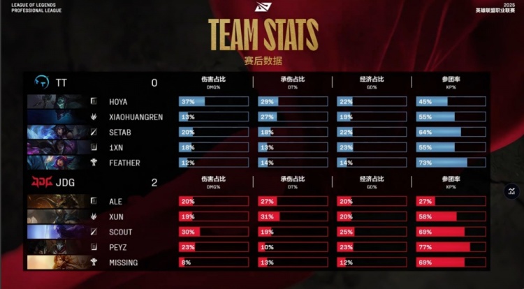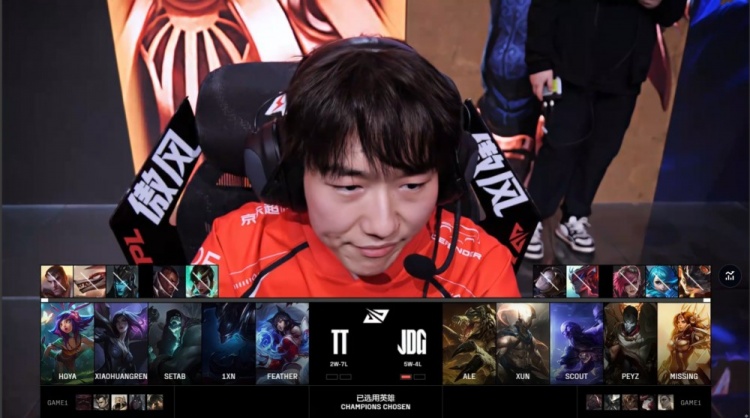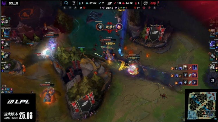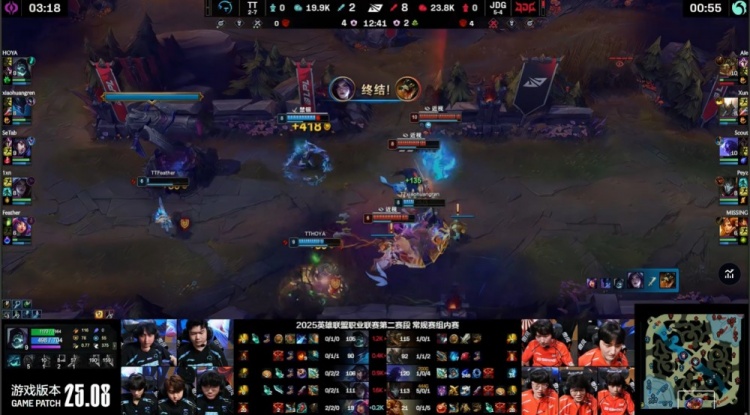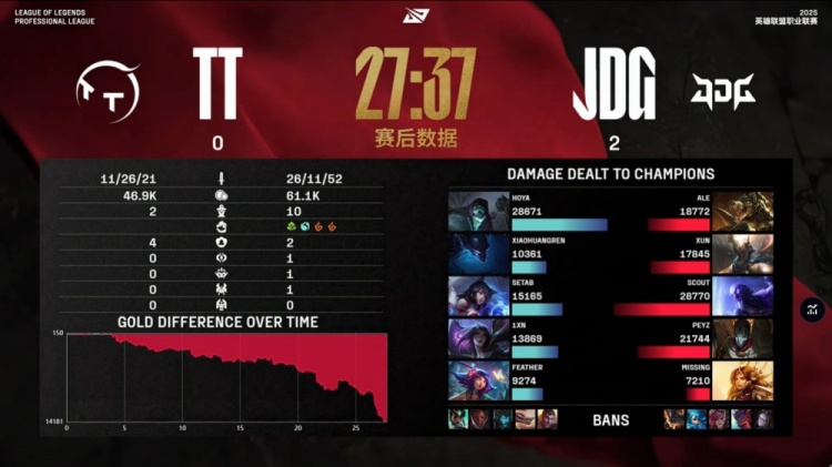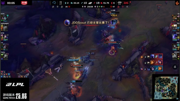 中期TT尝试反扑,Feather妮蔻与Setab狐狸配合击杀Xun与Scout打出0换2,但JDG通过推塔与控图稳固优势。