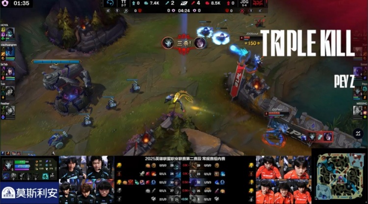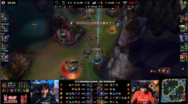 第二局前期JDG多点开花,3分半河道团战Scout瑞兹闪现带走小黄人,Peyz烬收下三杀,JDG迅速建立优势;随后Ale鳄鱼下路1v2强杀1xn得手,JDG全面起势。