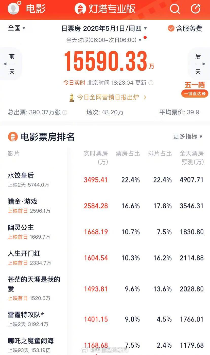 截至昨日下午19点,五一档首日(5月1日)大盘票房超1.5亿元,《水饺皇后》以3495万元票房领跑。根据灯塔AI票房预测显示,影片总票房预测超3亿元,有望成为今年五一档票房冠军。《猎金·游戏》和《幽灵公主》分列票房第二、第三。