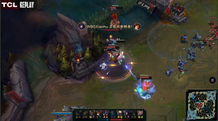 【5:38】野区团战,beichuan先被打残,xiaohu狐狸找到草丛的beichuan将其击杀,knight岩雀送xiaohu双杀,xiaohu再追击Elk打出其净化在拿到击杀拿到第3个人头,阿bin兰博下路单杀Light卡莎,WBG打出1换4。