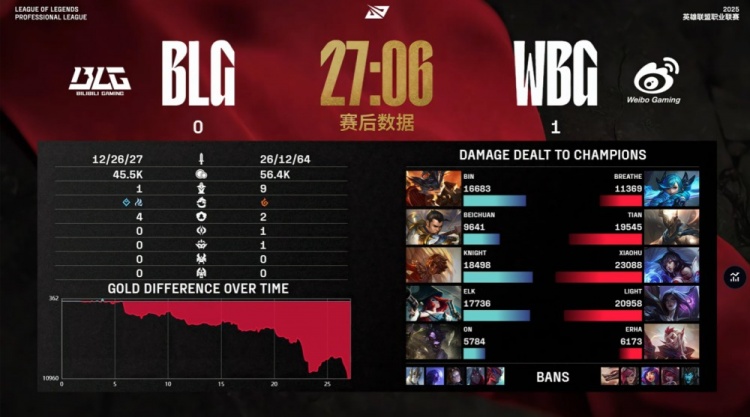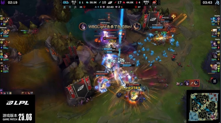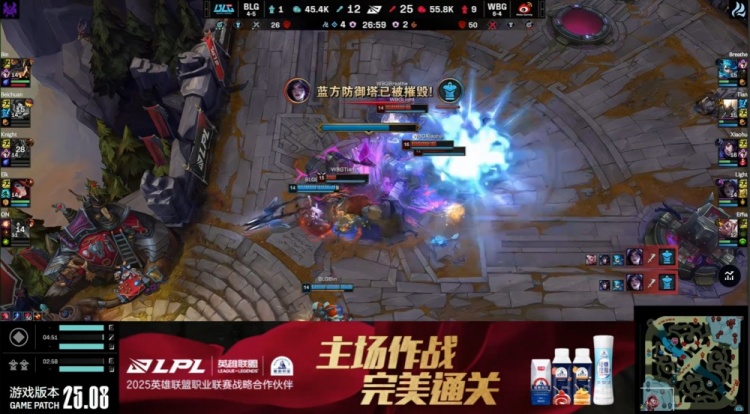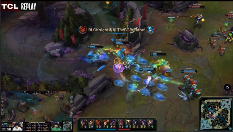 后期BLG正面再无一战之力,虽然野区抓住WBG失误打出0换2,但WBG休整过后中路推上BLG高地将强行推平基地先下一城。