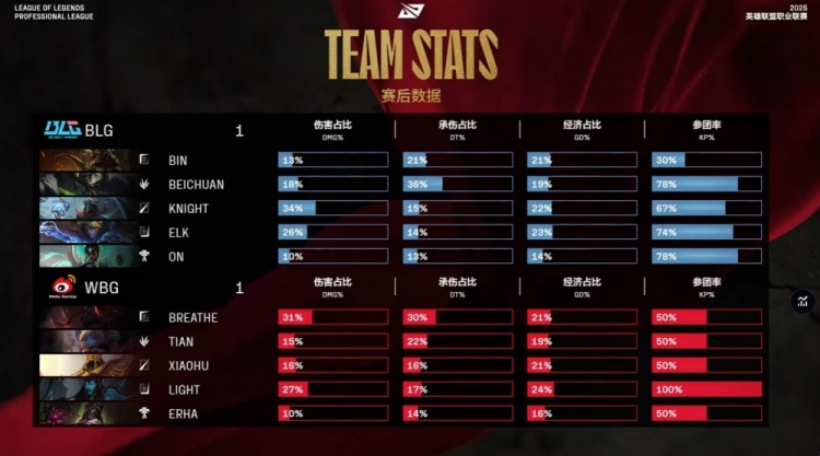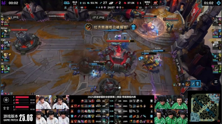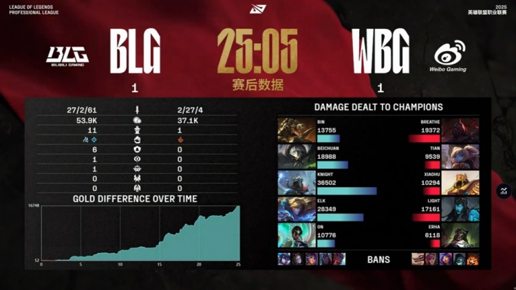 中期小龙团阿Bin鳄鱼游龙双杀,BLG强势打出0换5团灭WBG,15分钟经济领先8k。后期双方正面战力不在同一级别,WBG毫无一战之力,xiaohu沙皇中路TP绕后推beichuan无济于事,BLG轻松25分钟推平WBG基地扳回一城。