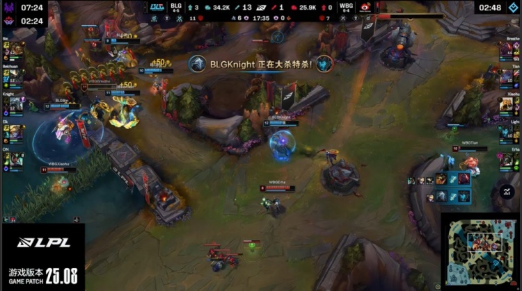 【17:22】河道混战,beichuan蝎子拉两人,xiaohu沙皇侧面推两人无济于事,阿Bin咬死Breathe,Elk点掉xiaohu,knight野区减速Erha,Erha秦王绕柱来下路三角草按B回城,BLG经济领先1w。