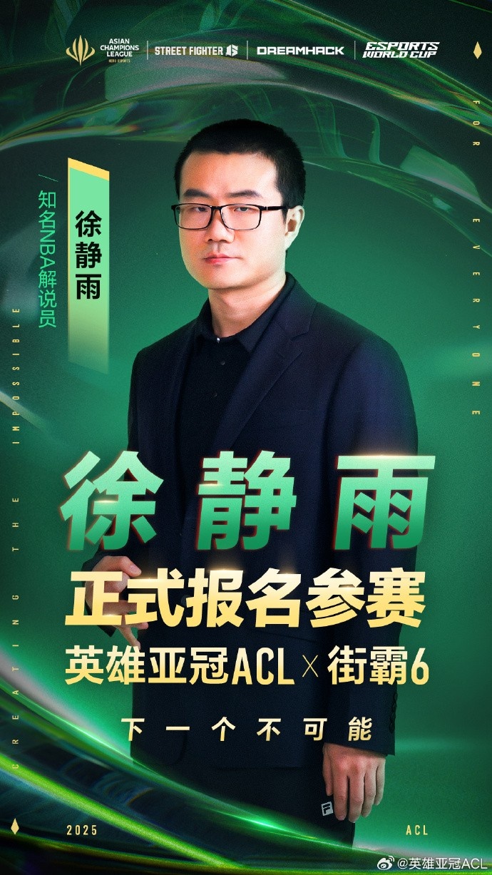 >你也来跨界?知名篮球解说徐静雨参加2025英雄亚冠ACL街霸6比赛