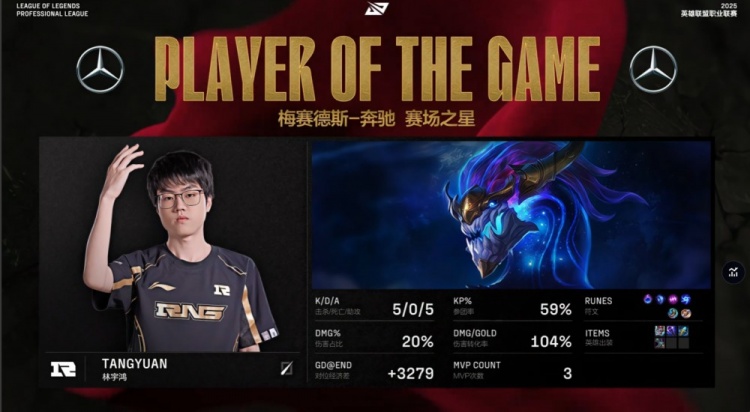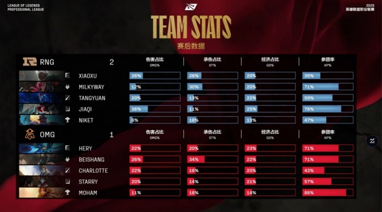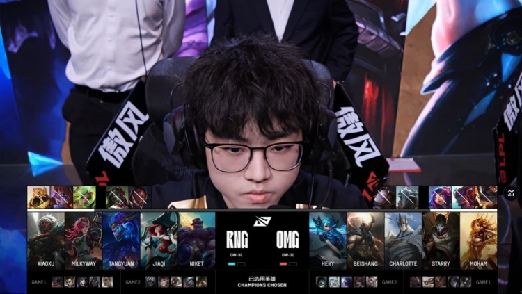 决胜局前期beishang潘森上路绕后与Hery越塔带走一血,但后续beishang再来上路越塔,Moham扛塔失误被Xiaoxu反杀,RNG双人组赶到上路追击,OMG被打出0换4。RNG随后持续力保tangyuan龙王发育。