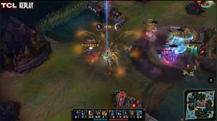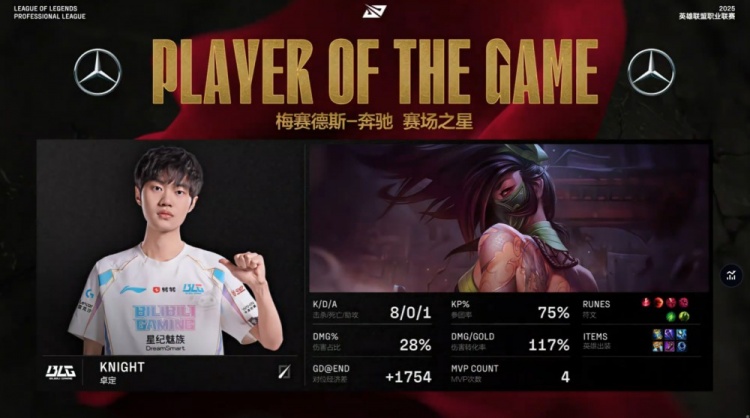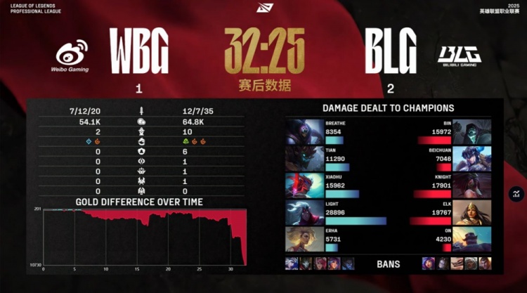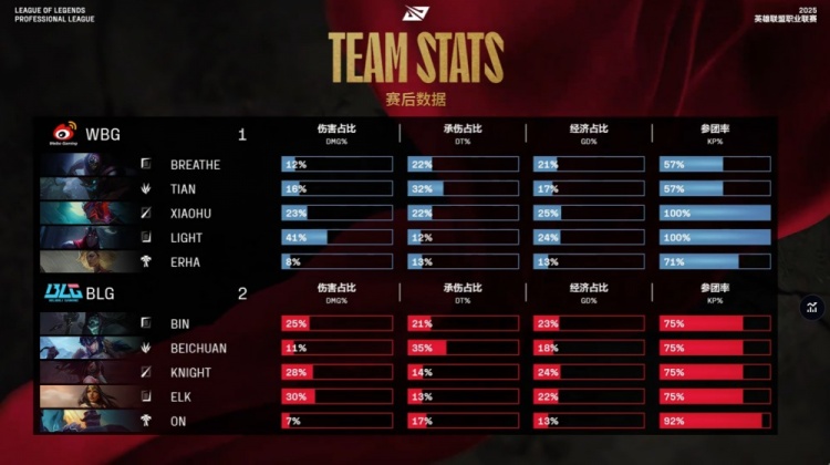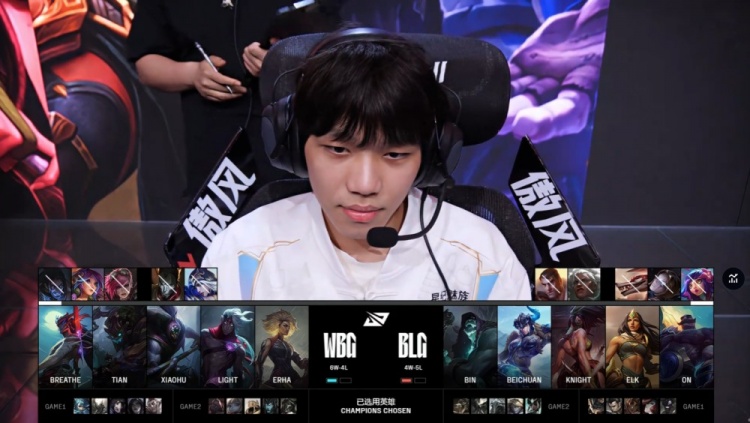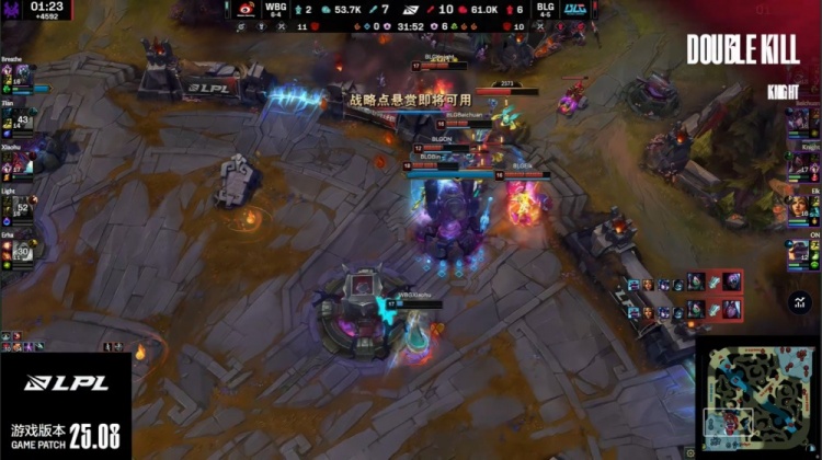 决胜团WBG先手配合拉满,但knight阿卡丽完美进场斩落xiaohu永恩,BLG打出0换2顺势拿大龙。最终BLG中路推进,ON布隆隔墙先手开到Light,beichuan精准甩狙定住Light,knight游龙高地三杀收割,BLG团灭WBG,一波推平WBG基地拿到比赛胜利。