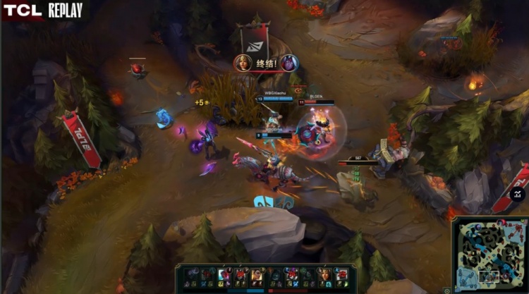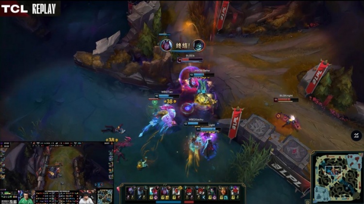 【19:06】下路三角草,小天被挂ON布隆被动后阵亡,beichuan入侵WBG野区,Erha芮尔反手开beichuan,xiaohu永恩侧面开大进场砍出双杀,WBG打出2换3,双方经济差距回到1k之内。