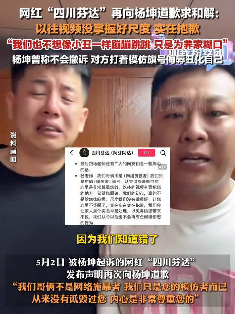 被杨坤起诉的网红“四川芬达”发布声明,再次向杨坤道歉,“我们哥俩不是网络施暴者,我们只是您的模仿者而已,从来没有诋毁过您,内心是非常尊重您的”。