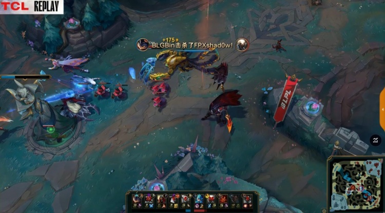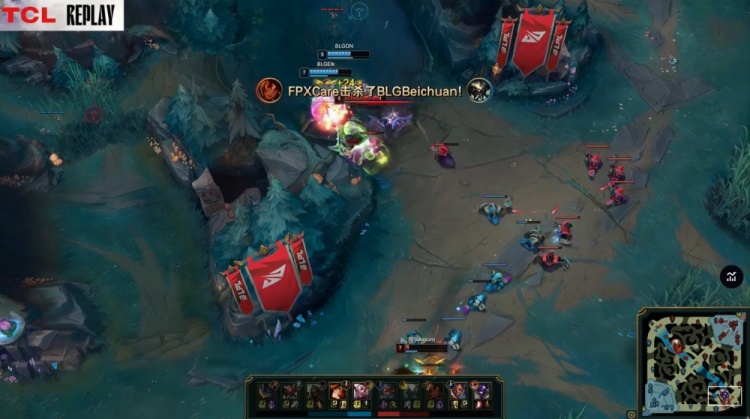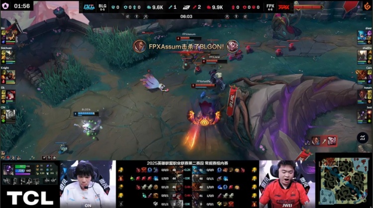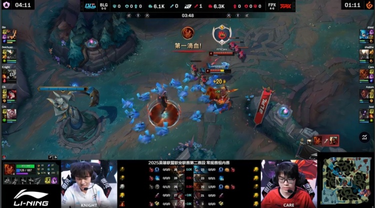 【9:36】河道团战,Care岩雀抬两人,knight劫R进人群爆掉FPX两人拿到双杀,同时下路2V2,ON开大抬飞Assum拿到人头,BLG打出0换3,经济领先1k。