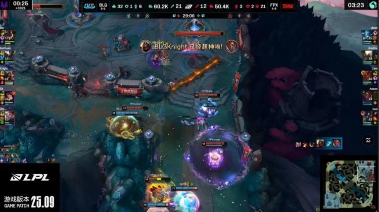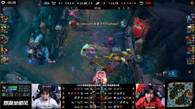 【25:41】河道团战,beichuan蝎子拉shadow,knight再将其秒掉,beichuan再推Care上墙,Knight切掉Assum卢锡安拿到双杀,Elk女枪三杀,BLG打出1换5团灭FPX后吃掉大龙,经济领先7k。