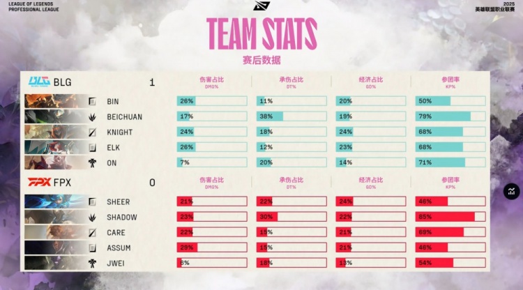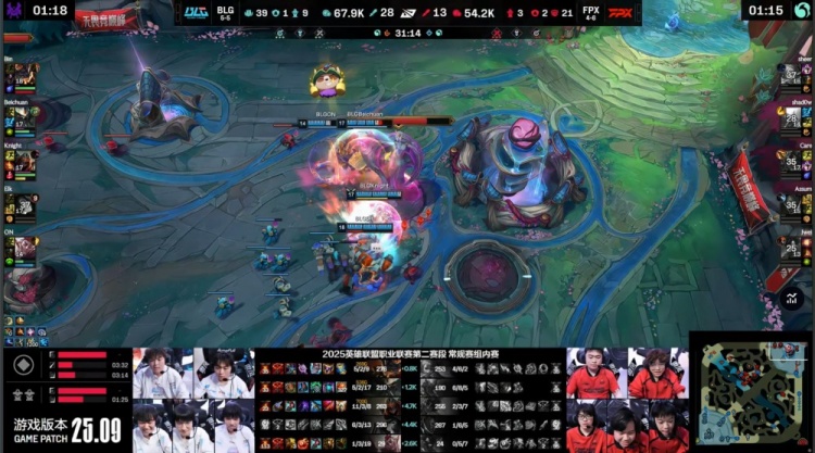 第一局前期FPX野辅中联动打出完美节奏,Shadow潘森频繁游走,中期前通过下路控线与上中支援,多次击杀Knight劫与Elk女枪,FPX稳控前15分钟主动权,BLG则依靠Beichuan蝎子与阿Bin兰博小规模团战回应,拖住节奏。