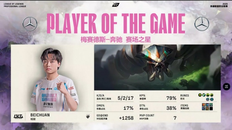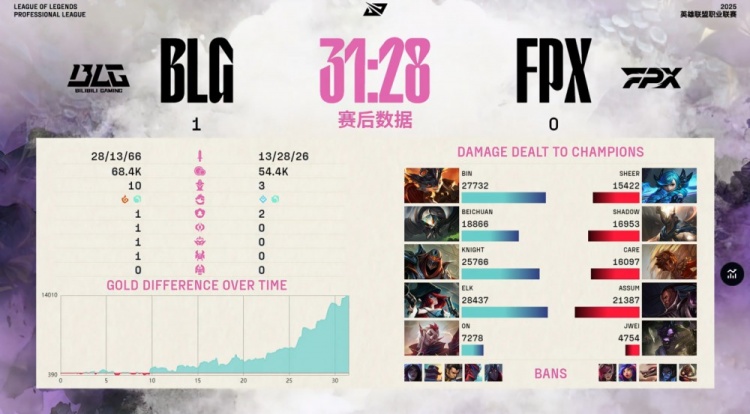 后期BLG稳步控图扩大经济差,Knight劫持续压制Assum卢锡安输出空间,ON洛绕后多次控住关键目标,最终河道一波阿Bin兰博洒大三,BLG杀团灭FPX,一波推平FPX基地先下一城。