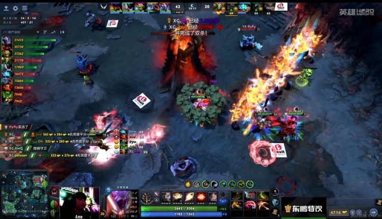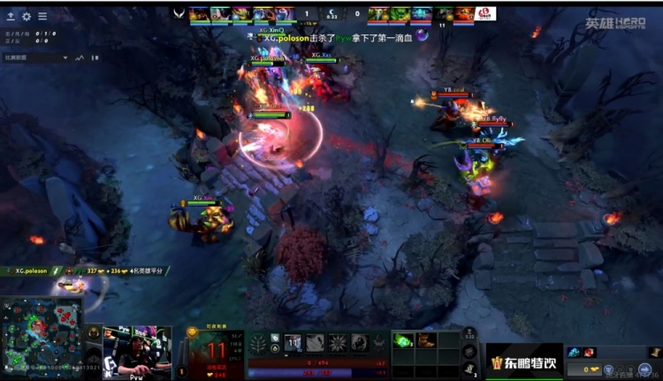 【8分钟】河道团Pyw小强被秒,YB集火双头龙还浪费了个马尔斯大招!残局XinQ米拉娜流星补伤害,Xm沙王抗住伤害等到了队友支援!开飞后排的flyfly先知被XG三人强杀!这波最终是XG打了个1换3!