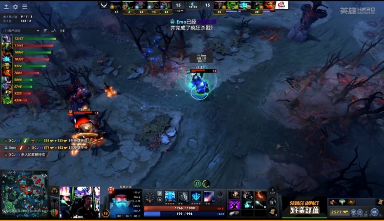 【12分钟】XG开雾下路撞到了Emo蓝猫,但是阿托斯先手没有伤害被Oli骨法奶住了!Emo蓝猫反手配合队友先秒XG双酱油,形成正面五打二!zeal马尔斯框大配合队友强杀Xm沙王!再越塔强杀了Ame的TA!Xxs末日赶到换了两个,再配合复活TP的poloson双头龙留住了蓝猫!这波最终是YB打了个3换4!